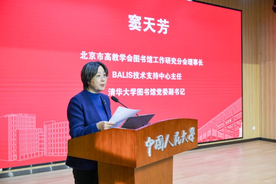 北京市高教学会图书馆工作研究分会理事长、BALIS技术支持中心主任、清华大学图书馆党委副书记窦天芳在开幕致辞中强调,图书馆作为文明传承的重要阵地,在人工智能深度介入知识组织与服务的时代面临新挑战与新使命。她表示,AI正在从工具型技术转向推动图书馆结构性革新的关键力量,希望行业在理论创新、实践探索与人才培养方面协同发力,以更加开放、智慧的姿态迎接图书馆的未来。