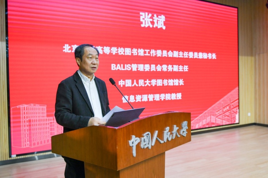 会议开幕式由中国人民大学图书馆党委书记牟锋主持。他代表承办单位对与会嘉宾的到来表示热烈欢迎,并介绍了到场的各位领导与专家学者,强调本次年会得到了北京高校图工委和BALIS管理中心的大力支持,全面展现了图书馆界区域协同发展、共同推进智慧化建设的良好氛围。